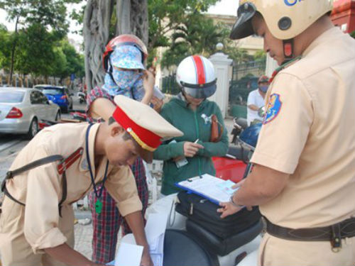![]() Học sinh đội mũ bảo hiểm nhưng không cài quai cũng bị xử lý. Trường hợp này bị xử phạt 15.000đ và gửi thông báo về trường. |