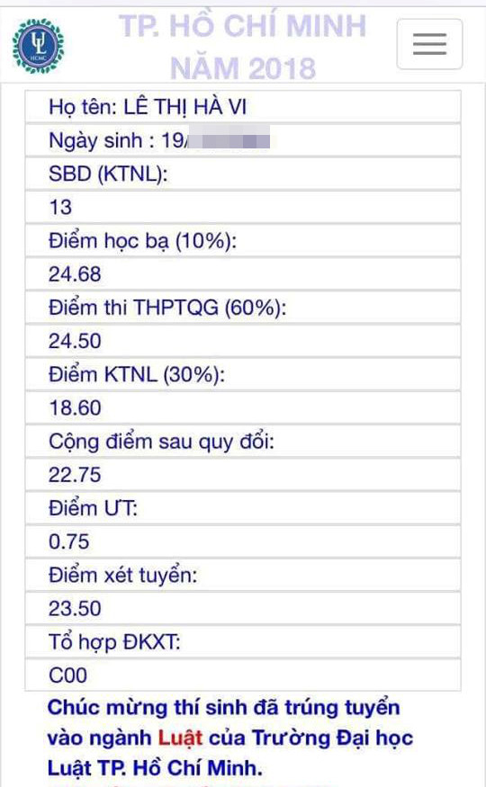 Hà Vi nhận được thông báo trúng tuyển vào ngành Luật của ĐH Luật TP.HCM - Ảnh: Tri thức trực tuyến |