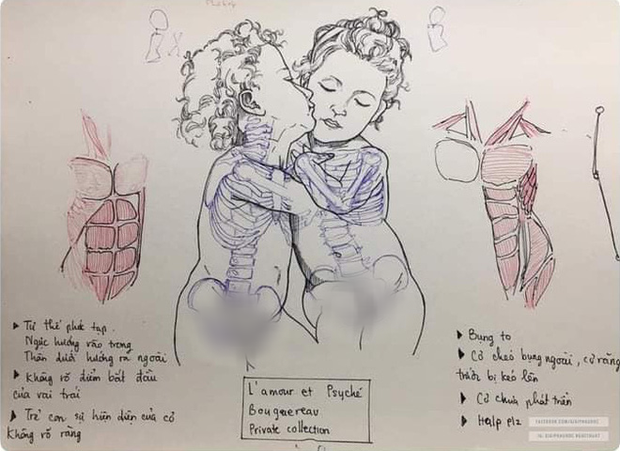 Nữ sinh Hà Nội thể hiện rõ gân tay, múi cơ, khung xương hay cả cảm xúc của nhân vật. Với mỗi bức hình, Ánh Linh còn chú thích kỹ càng như “Tư thế phức tạp khi ngực hướng vào trong, thân dưới hướng ra ngoài”, “không rõ điểm bắt đầu của vai trái”, “bụng to”, “cơ chưa phát triển”,...