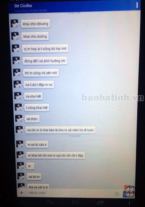 Đặc biệt, T. vẫn thường xuyên nhận được tin nhắn đe dọa, yêu cầu T. không được làm lớn chuyện, nếu không sau này phải trả giá đắt. Theo nữ sinh này cho biết, nhóm Bé đánh T. là do nghi ngờ giữa T. và bạn trai Bé có tình cảm với nhau.