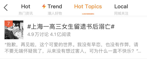 Mới đây, trang ETToday đưa tin về việc nữ sinh trung học có tên Hân Hân ở Thượng Hải (Trung Quốc) nhảy sông tự tử nhận được nhiều tranh cãi từ dư luận.