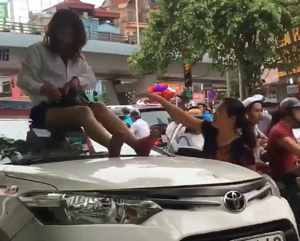 | Nữ tài xế taxi mặc váy ngồi nóc ô tô chống đối CSGT |