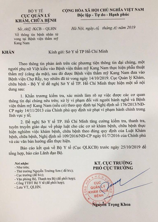 Đến ngày 16/10, Cục Quản lý Khám, chữa bệnh - Bộ Y tế, đã có công văn khẩn đề nghị Sở Y tế TP.HCM khẩn trương kiểm tra, xác minh làm rõ sự việc nữ bệnh nhân tử vong sau khi căng da mặt tại Bệnh viện Thẩm mỹ Kangnam TP.HCM.