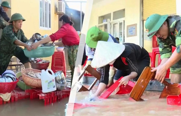 Còn trên địa bàn huyện Đức Thọ (Hà Tĩnh), sau lũ, côn trùng, sâu bọ và cả rắn rết bò khắp trường Mầm non Tùng Châu. Lo sợ các loài động vật sẽ gây hại cho các em học sinh, các giáo viên cùng lực lượng Bộ chỉ huy quân sự huyện Đức Thọ đã tập trung tổng vệ sinh, tiêu độc khử trùng tại các lớp học.