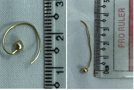 Chiếc khuyên tai bằng vàng được lấy ra từ thực quản bé gái. Ảnh: báo VnExpress |