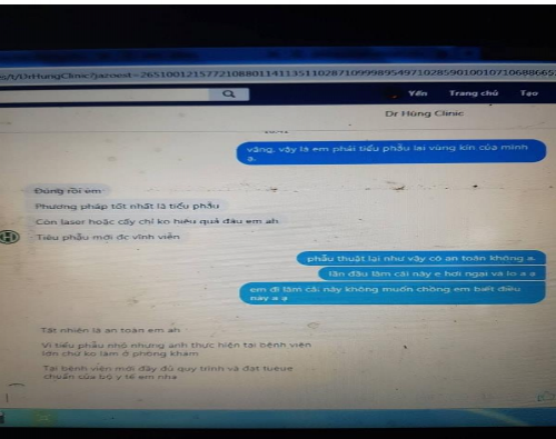 Thời gian qua, nhiều khách hàng đã tìm đến cơ sở mang tên Phòng khám chuyên khoa tiết niệu Dr.Hung, có địa chỉ tại 454 phố Khương Đình (phường Hạ Đình, quận Thanh Xuân, Hà Nội) để thực hiện các dịch vụ thẩm mỹ, làm đẹp vùng kín.