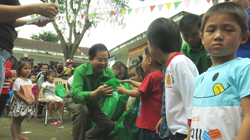 | Ông Lâm Văn Hải, giám đốc điều hành công ty NutiFood trao quà cho các bé mầm non ở Hương Khê Hà Tĩnh |