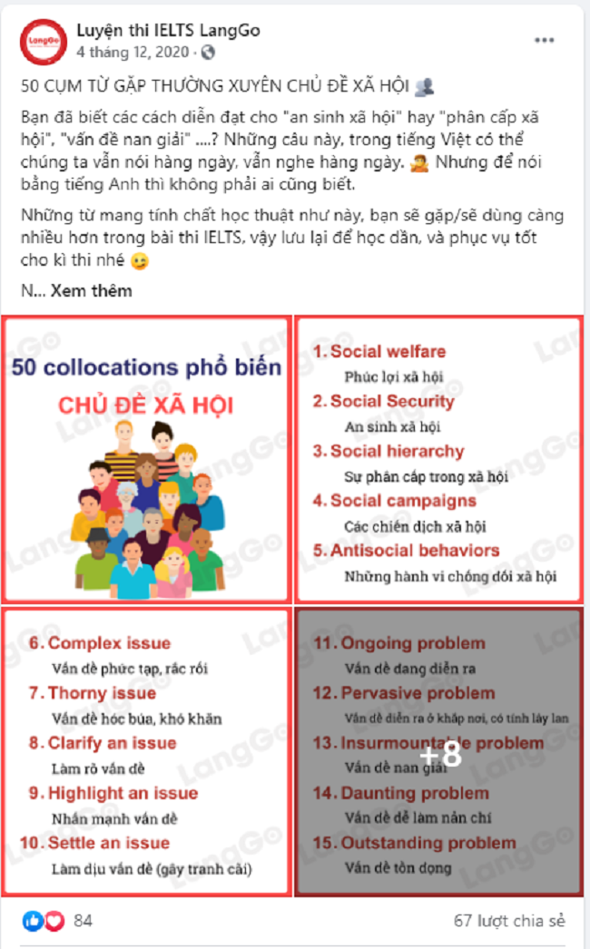 | Ngoài ra, Fanpage cũng đăng tải kinh nghiệm thi của các “cao thủ” IELTS đã trưởng thành từ LangGo |