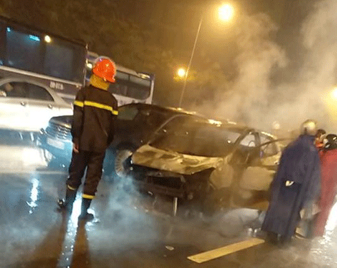 Chiếc ô tô bốc cháy dưới trời mưa. Ảnh infonet |