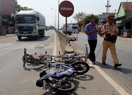 Tại hiện trường, 4 chiếc xe đạp điện hư hỏng nặng. Vụ tai nạn đã gây ùn tắc giao thông trên quốc lộ hơn 1 giờ đồng hồ.