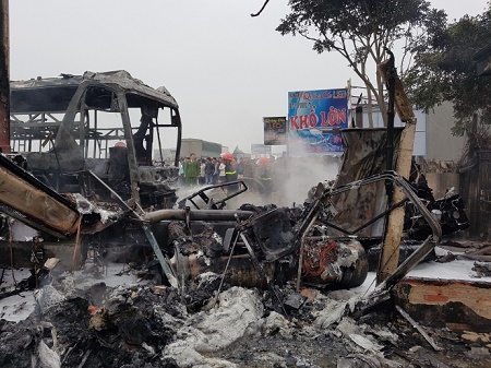 Theo báo Giao Thông, tại hiện trường, chiếc xe ô tô khách mang BKS: 36B-014.23 cháy rụi hoàn toàn, đầu xe container và phần nhà của người dân cũng bị thiêu rụi.