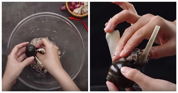 - Cuốn hỗn hợp thịt ốc vào trong lá sả, cho vào từng vỏ ốc và đem hấp chín.