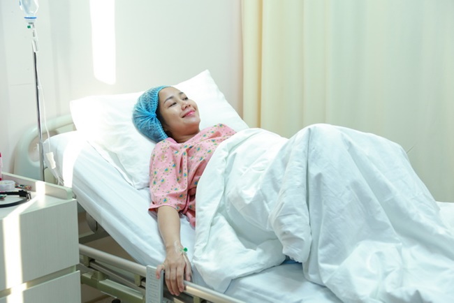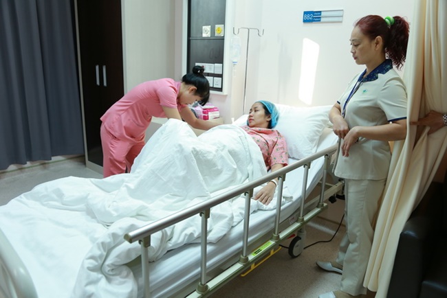 Sau một tiếng rưỡi phẫu thuật, "Ốc" Thanh Vân được chuyển vào phòng hồi sức nghỉ ngơi, trong khi ông xã chăm sóc con và cho bé bú bình.