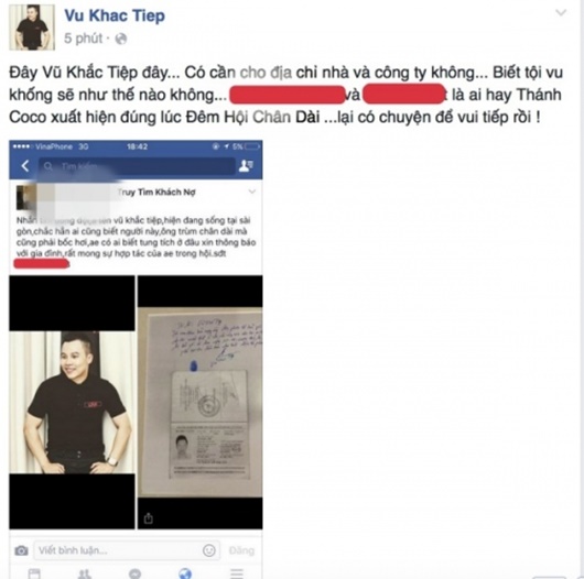 “Nhắn tìm đồng đội, anh tên Vũ Khắc Tiệp, hiện sống tại Sài Gòn. Chắc hẳn ai cũng biết người này, ông trùm chân dài mà cũng phải bốc hơi. Anh em có ai biết tung tích ở đâu xin thông báo với gia đình. Rất mong sự hợp tác của anh em trong hội”, người này viết. Kèm theo dòng chia sẻ là một bức thư tay được cho là của Vũ Khắc Tiệp viết khi hỏi mượn tiền.