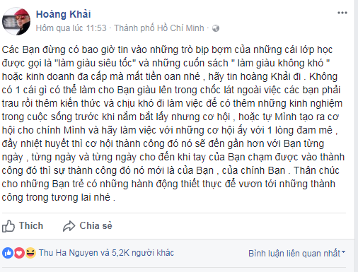 Cụ thể, Hoàng Khải chia sẻ: “Các bạn đừng có bao giờ tin vào những trò bịp bợm của những cái lớp học được gọi là "làm giàu siêu tốc" và những cuốn sách “làm giàu không khó” hoặc kinh doanh đa cấp mà mất tiền oan nhé , hãy tin Hoàng Khải đi.