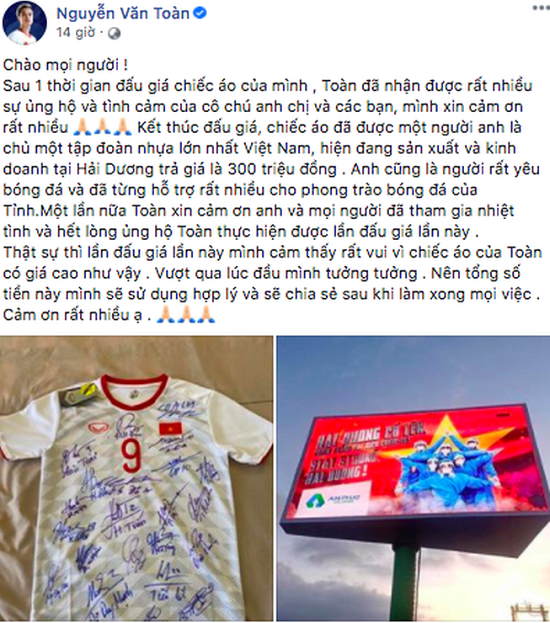 Theo chia sẻ của Văn Toàn, chiếc áo số 9 có chữ kí của các cầu thủ được đấu giá 300 triệu đồng đã thuộc về "chủ một tập đoàn nhựa lớn nhất Việt Nam".