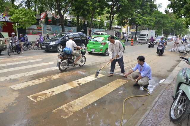 Mặt đường được rửa sau khi lực lượng chức năng quận 1 lập biên bản. Ảnh: Dân Việt. |
