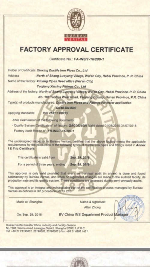 Chính vì tuân thủ nhiều tiêu chuẩn quốc tế ngặt nghèo nói trên, sản phẩm ống gang dẻo Hãng XinXing các Tổ chức quốc tế cấp các giấy chứng nhận: Giấy chứng nhận của đơn vị kiểm định Anh Quốc uy tín trên thế giới WRAS cho lớp xi măng bên trong lòng ống gang dẻo là phù hợp và đạt tiêu chuẩn dùng cho cấp nước sinh hoạt của con người; Giấy chứng nhận của đơn vị kiểm định Anh Quốc uy tín trên thế giới WRAS cho gioăng cao su dùng để lắp ống gang dẻo là phù hợp và đạt tiêu chuẩn dùng cho cấp nước sinh hoạt của con người; Giấy chứng nhận của đơn vị kiểm định Anh Quốc uy tín trên thế giới WRAS cho mỡ dùng để lắp ống gang dẻo là phù hợp và đạt tiêu chuẩn dùng cho cấp nước sinh hoạt của con người; Hệ thống quản lý của nhà sản xuất XinXing đạt tiêu chuẩn ISO 9001 – 2008; Hệ thống quản lý môi trường của nhà sản xuất XinXing đạt tiêu chuẩn ISO 14001…