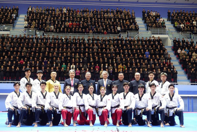 Các vận động viên taekwondo và quan chức Hàn Quốc, Triều Tiên chụp ảnh chung tại nhà thi đấu ở Bình Nhưỡng hôm 1/4 - Ảnh: Korea Times. |