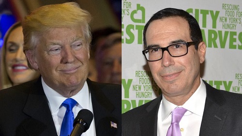 Tổng thống đắc cử Donald Trump (trái), cựu lãnh đạo của tập đoàn Goldman Sachs, ông Steven Mnuchin - Ảnh: Yahoo |