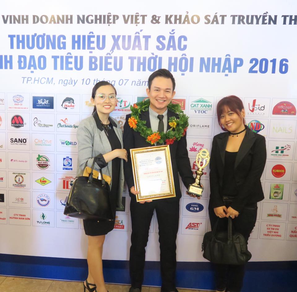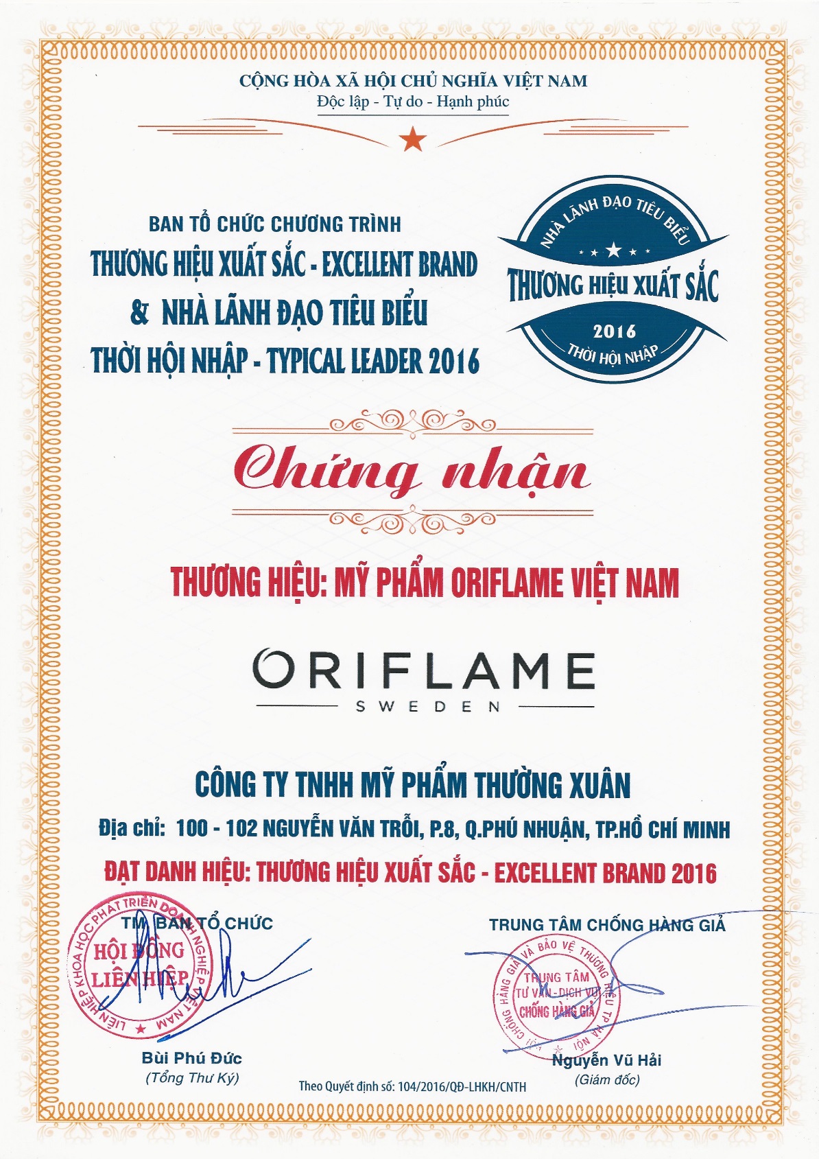 Ngày 10/7 vừa qua, Oriflame vừa được công nhận và trao giải thưởng Thương hiệu Xuất sắc 2016, đây là giải thưởng có sự bảo trợ của các cơ quan ban ngành như: Văn Phòng Quốc Hội - Vụ Công Tác Phía Nam, Cục Ứng Dụng Và Phát Triển Công Nghệ - VP Phía Nam, Trung Tâm Phát Triển Tài Sản Trí Tuệ - Cục SHTT - Bộ KH&CN, Liên Hiệp Khoa Học Phát Triển Doanh Nghiệp Việt Nam, Trung Tâm Chống Hàng Giả, và được truyền hình trực tiếp trên Đài Truyền Hình Tp.HCM.