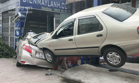 Đang lưu thông trên đường, xe ôtô 4 chỗ bất ngờ húc gãy cây xanh rồi tiếp tục lao vào tiệm garage, rồi tông vào hông một ngôi nhà ven đường.