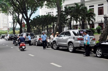 Tại tòa nhà của Sở Giao dịch chứng khoán TPHCM, gần 10 chiếc ô tô đậu ngay trên vỉa hè bị lực lượng chức năng đến nhắc nhở.