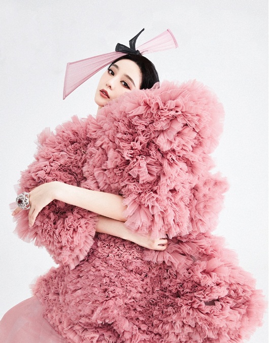 Bộ đầm hồng cực kỳ khó mặc ở trang bìa mà Phạm Băng Băng đã thể hiện xuất sắc là một tác phẩm của NTK Cory Trần. |