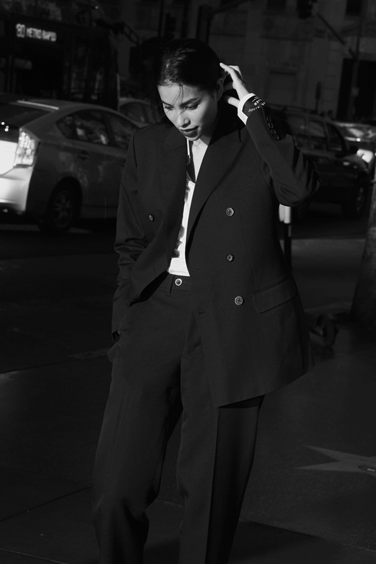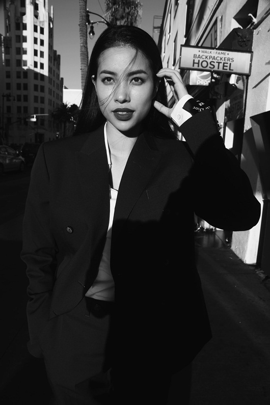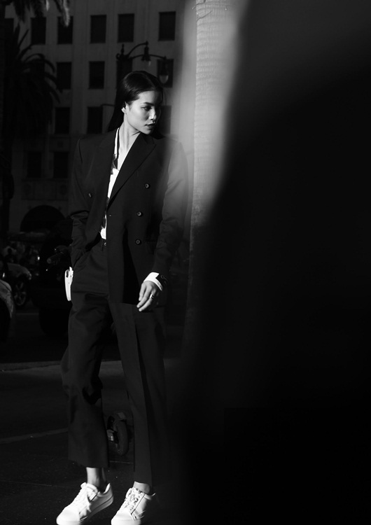 Phạm Hương diện vest đơn giản nhưng cực kỳ cá tính (phong cách menswear), mái tóc thả dài. |