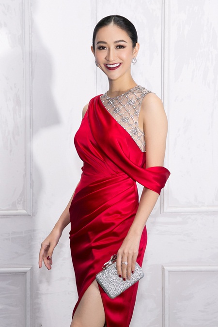 Nếu như Hoa hậu Phạm Hương thanh lịch với chiếc đầm xòe trắng cổ vest thì cũng với dáng đầm xòe, nhưng Đỗ Mỹ Linh lại lộng lẫy với sắc đỏ trong chiếc đầm lệch vai.