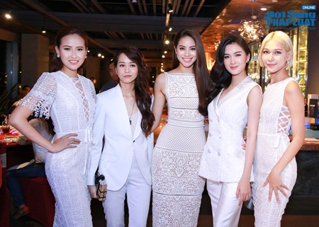 Giữa không gian sang trọng và ấm cúng của buổi tiệc, HLV Phạm Hương và 4 thí sinh nổi bật trong những bộ trang phục tông trắng của NTK Chung Thanh Phong.
