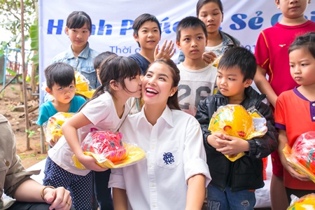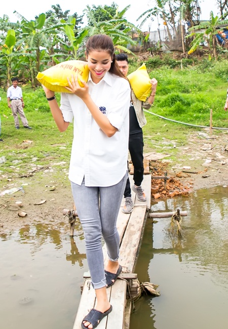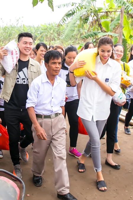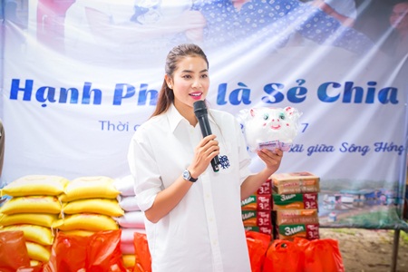 Hoa hậu Hoàn vũ Việt Nam 2015 Phạm Hương cùng các fan đã vừa thực hiện chương trình thăm và tặng quà cho 27 hộ dân nghèo ở bãi giữa sông Hồng, đồng thời tặng 18 con heo đất cho các em học sinh nơi đây.