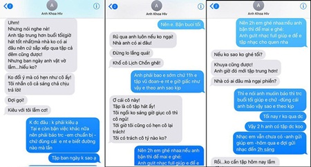Theo đó, trong loạt tin nhắn mà Phạm Lịch đưa ra, người nhắn tin đến được lưu với tên Anh Khoa HLV. Người này liên tục đề nghị nữ vũ công đến tập hát tại nhà riêng vào thời gian giữa đêm khuya, với lý do nhà không có ai. Không dừng lại ở đó, người này còn vô tư gọi Phạm Lịch bằng cái tên nhạy cảm.