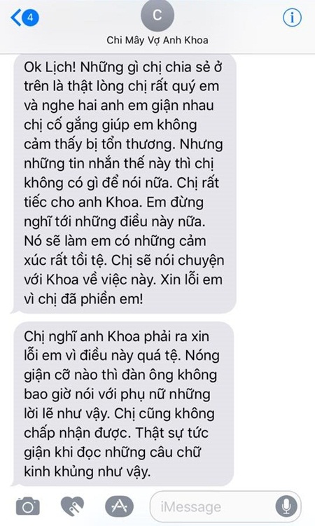 Dù vậy, càng về cuối cuộc trò chuyện, tần suất số điện thoại mang tên Mây cảm thông và xin lỗi Phạm Lịch thay chồng ngày càng dày đặc. Cô viết: “Chị không còn gì để nói nữa. Chị rất tiếc cho anh Khoa. Chị sẽ nói chuyện với Khoa về việc này. Chị nghĩ anh Khoa phải xin lỗi em vì điều này quá tệ. Nóng giận cỡ nào thì đàn ông không bao giờ nói với phụ nữ những lời lẽ như vậy. Chị cũng không chấp nhận được. Thực sự tức giận khi đọc những câu chữ kinh khủng như vậy”.