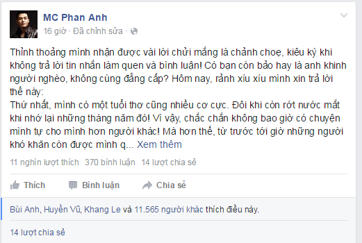 Chia sẻ trên Facebook cá nhân, MC Phan Anh cho biết thỉnh thoảng anh nhận được nhiều lời chửi mắng, chê bai chảnh chọe, kiêu kỳ khi không trả lời tin nhắn và bình luận. Thậm chí, một số người còn nói thẳng anh khinh người nghèo, không cùng đẳng cấp.