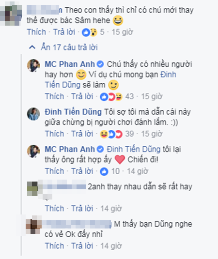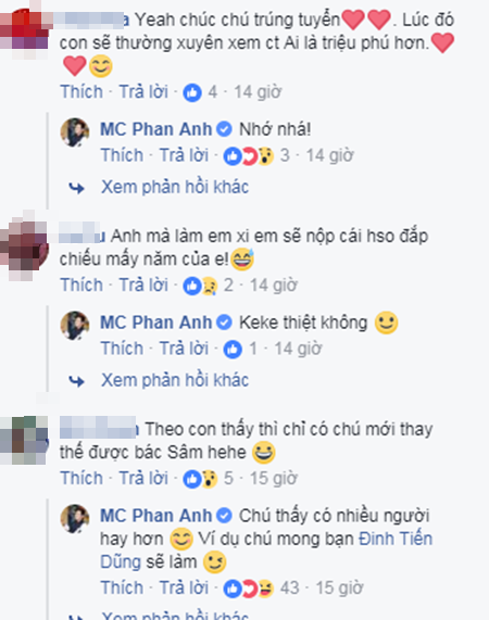 Chia sẻ này của Phan Anh nhận được nhiều sự ủng hộ của người hâm mộ. Thậm chí còn có ý kiến cho rằng vị trí này nhất định sẽ thuộc về MC Phan Anh. Tuy vậy, nam MC trả lời rất khiêm tốn rằng anh thấy có nhiều người dẫn cũng rất hay, sau đó đề cử "giáo sư Cù Trọng Xoay" Đinh Tiến Dũng. "Giáo sư Xoay" thì hài hước trả lời rằng "Tôi sợ tôi mà dẫn cái này giữa chừng bị người chơi đánh lắm!"