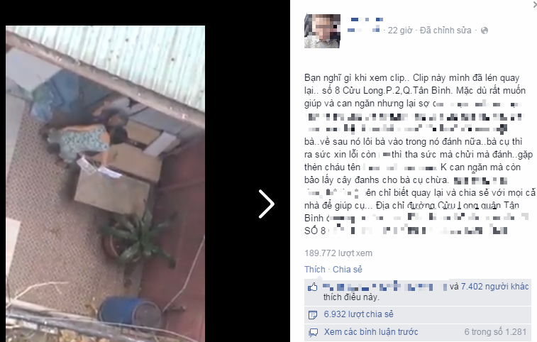 Facebooker Amie bức xúc: “Tuổi đã già rồi, con cháu không thương còn bị đánh đập, chửi bới. Đúng là con bất hiếu mới đối xử với mẹ mình như thế. Tình mẹ bao la nuôi con khôn lớn để rồi được trả hiếu như thế này đây. Có mẹ già không biết quý trọng lỡ một mai mẹ mất rồi có tìm lại được người mẹ đáng yêu còn có được nữa hay không. Còn cha còn mẹ hãy nên biết quý trọng”.