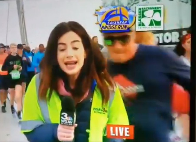 Theo những hình ảnh đoạn video ghi lại, khi phóng viên Alex Bozarjian đang cầm micro đứng trên cầu ở Savannah, bang Georgia, Mỹ để đưa tin trực tiếp về giải chạy bộ đang diễn ra tại đây thì bị một người đàn ông đeo kính râm, mặc áo phông đen dài tay bất ngờ vỗ mạnh vào mông.
