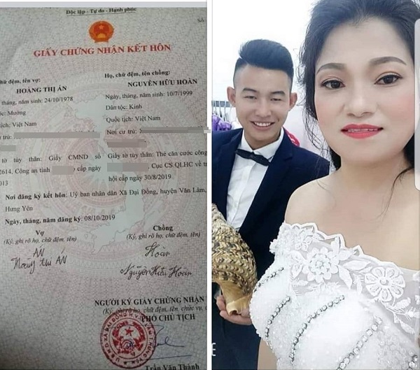 Thời gian vừa qua, mạng xã hội liên tục lan truyền tấm ảnh cưới của cô dâu Hoàng Thị Án (SN 1978, Phú Thọ), còn chú rể tên Nguyễn Hữu Hoàn (SN 1999, Hưng Yên). Kèm theo đó là giấy đăng ký kết hôn ghi rõ địa chỉ, ngày tháng năm sinh của cả hai người.