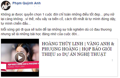 | Phạm Quỳnh Anh chia sẻ cả clip ghi lại chương trình họp báo và tâm sự đôi lời về scandal mà Hoàng Thùy Linh đã mạnh mẽ vượt qua. |