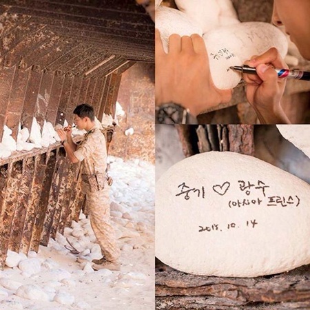 Trong thời gian phim phát sóng, hình ảnh hậu trường của "Hậu duệ Mặt Trời" đã khiến người hâm mộ cười nghiêng ngả. Bởi vì, mặc dù cực kỳ tình tứ với Song Hye Kyo trên màn ảnh, nhưng khi ở hậu trường thì Song Joong Ki lại tỉ mẩn ghi lại tên mình và Lee Kwang Soo trên một viên đá, vẽ cả hình trái tim ở giữa tên của hai người, thậm chí chú thích "Hoàng tử Châu Á" ở dưới tên của Lee Kwang Soo.