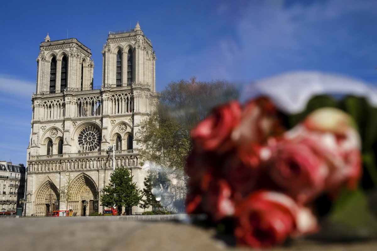 Một người vô danh đã dặt hoa trước nhà thờ Đức bà Paris sau vụ cháy - Ảnh: Xinhua. |