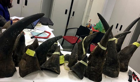 Ngày 14/3, tin từ Cục Hải quan thành phố Hà Nội cho biết, lực lượng hải quan Cửa khẩu sân bay quốc tế Nội Bài phối hợp với Cục Điều tra chống buôn lậu (Tổng cục Hải quan) vừa phát hiện một vụ vận chuyển hơn 100kg sừng động vật, nghi là sừng tê giác, qua đường hàng không từ châu Phi về Việt Nam.