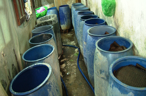 Các thùng nhựa đựng giá đỗ ủ với hóa chất. |
