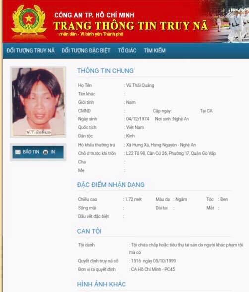Thông tin về đối tượng truy nã Vũ Thái Quảng - Ảnh: Cổng thông tin điện tử Công An Thành phố Hồ Chí Minh |
