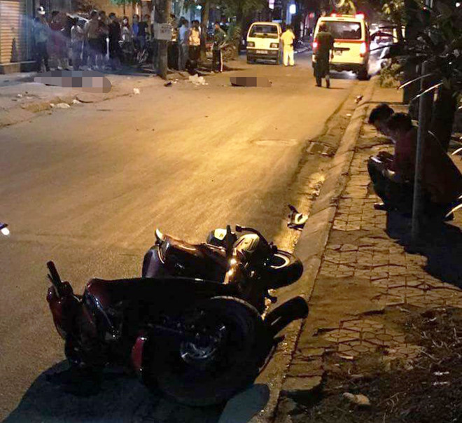 Tại hiện trường, một người nằm trên vỉa hè, một người ở dưới lòng đường, cách đó khoảng 10m là chiếc xe máy.