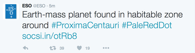 Tạm dịch: Một hành tinh có khối lượng tương đương Trái đất được tìm thấy trong vùng duy trì sự sống xung quanh Proxima Centauri. |