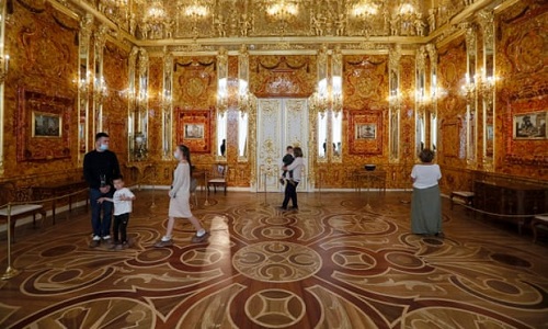 Bản sao của căn phòng Hổ phách được thợ thủ công Nga xây dựng lại ở cung điện Catherine. Ảnh: The Guardian |