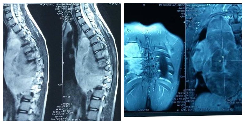 Theo Phó GĐ BV nhi đồng 1 Đào Trung Hiếu, khi chụp X-quang và MRI phát hiện cột sống bệnh nhi bị vẹo và có khối u lớn với đường kính 21 cm chèn ép phổi, tim, động mạch chủ.