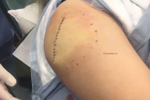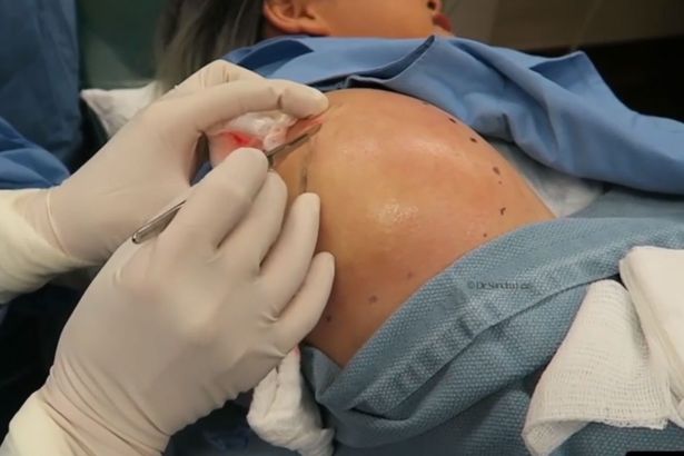 Khi Tiến sĩ Lee tiến hành cắt mở cánh tay của bệnh nhân liền làm lộ ra các vật thể trắng khổng lồ - cái được gọi là u mỡ - Stacey tiết lộ rằng cô nhận thấy vấn đề gì đó cho đến gần đây.